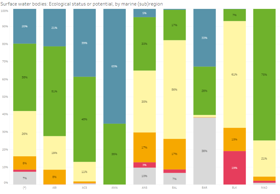 The dashboard shows the ecological status or potential ecological status, by area, of surface water bodies categories: transitional, coastal and territorial waters, as reported by EU Countries during the 1st and 2nd cycle of the Water Framework Directive (WFD) - River Basin Management Plan (RBMP). River Basin Districts (RBDs) were overlaid and mapped with marine subregions.